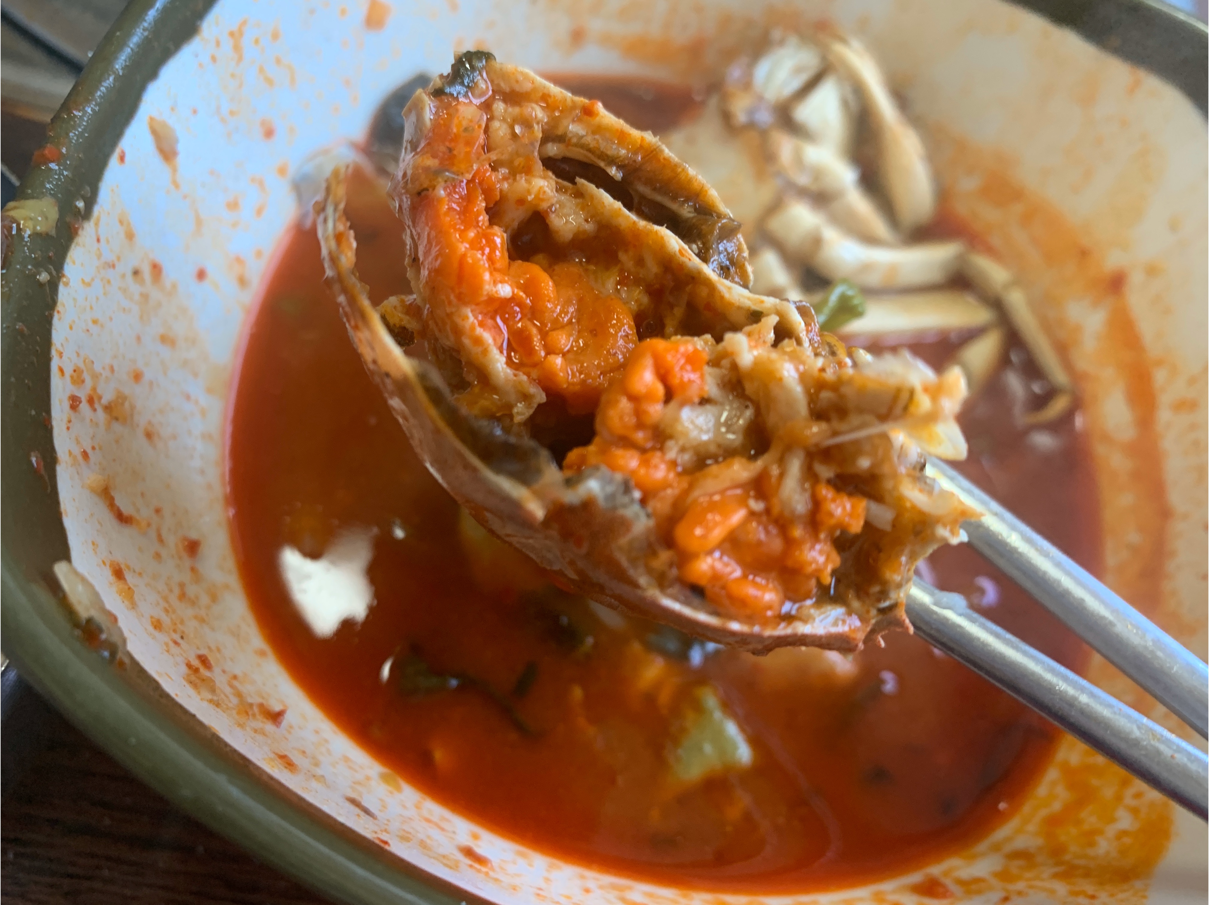 등껍질에 있는 붉은 알을 수저로 긁어서 드셔보세요.