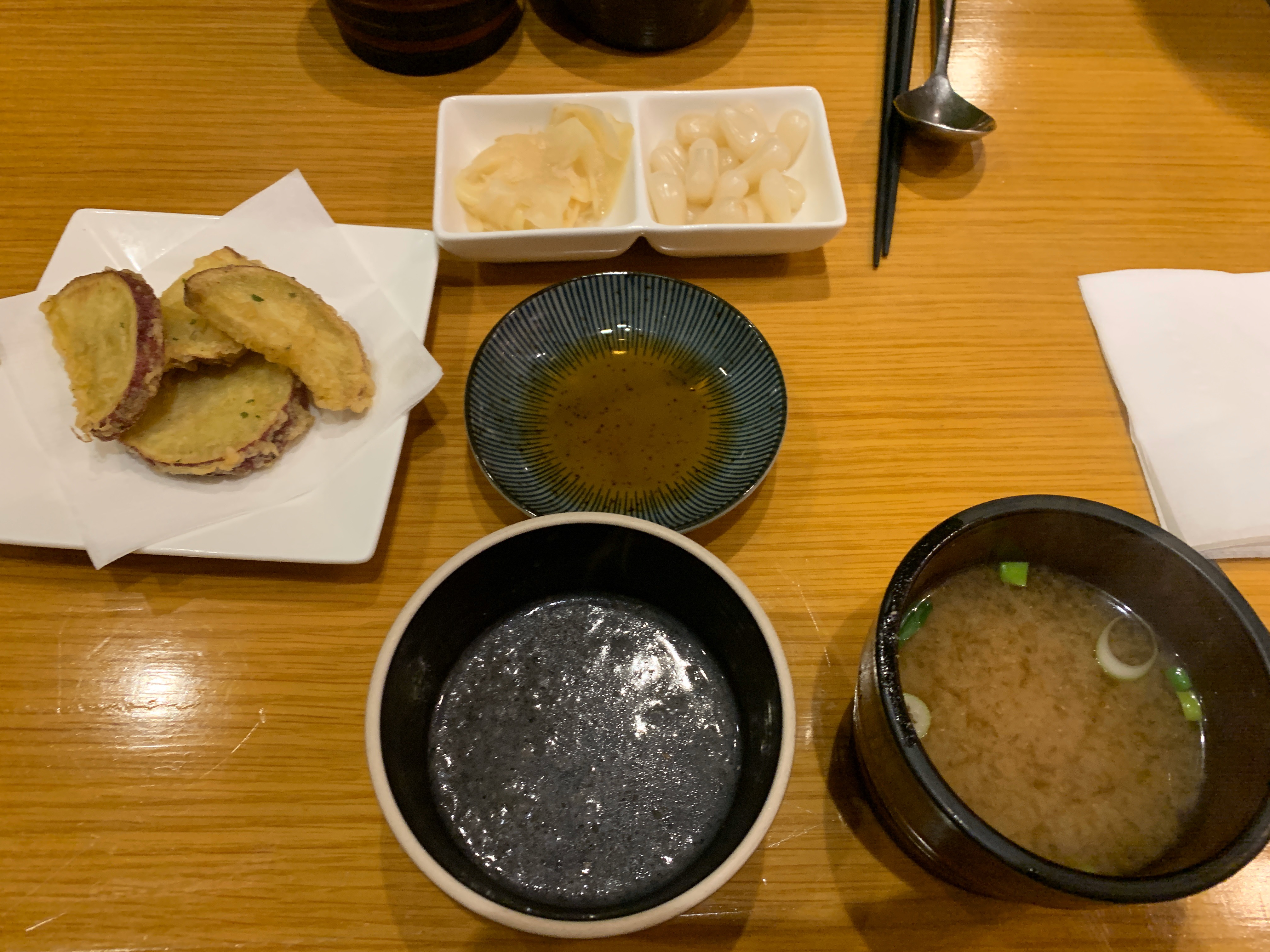 따뜻하게 바로 튀겨진 튀김과 고소한 흑임자죽이 에피타이져!